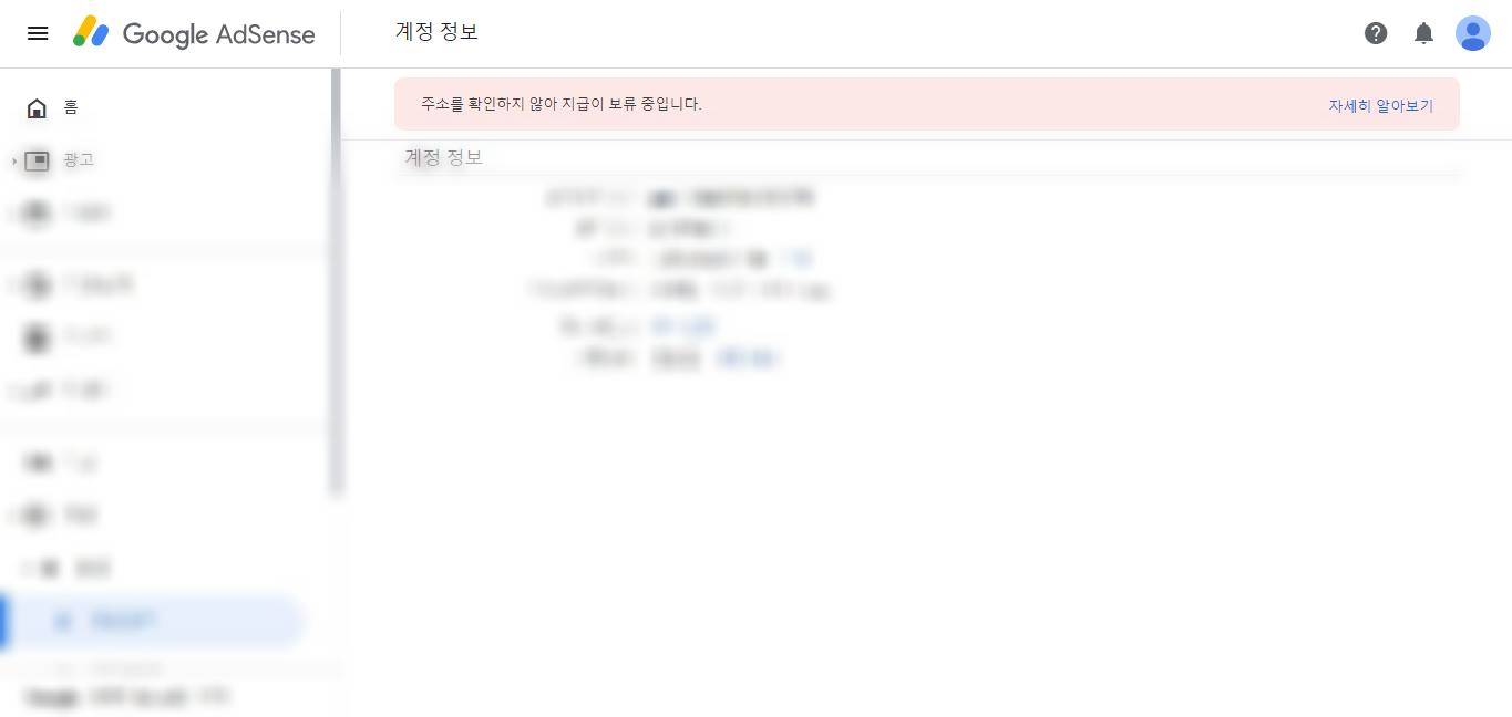 구글 애드센스 수익이 10달러를 넘어가면 아래 사진처럼 주소를 확인하지 않았다고 뜨게 됩니다.