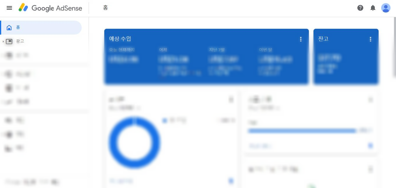 그럼 이것을 등록해 보도록 하겠습니다. 먼저 구글 애드센스 홈에 들어가 계정을 클릭, 계정 정보를 클릭합니다.