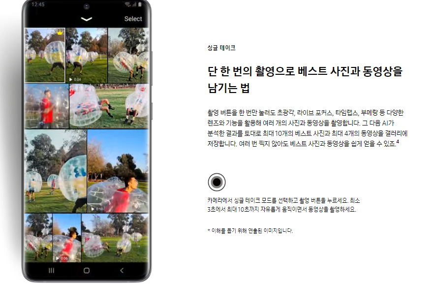 바로 싱글 테이크라는 모드인데요, AI가 장면을 분석하여 자신이 알아서 렌즈와 모드를 설정하여 여러 장의 사진을 찍는 기술이라고 합니다.
