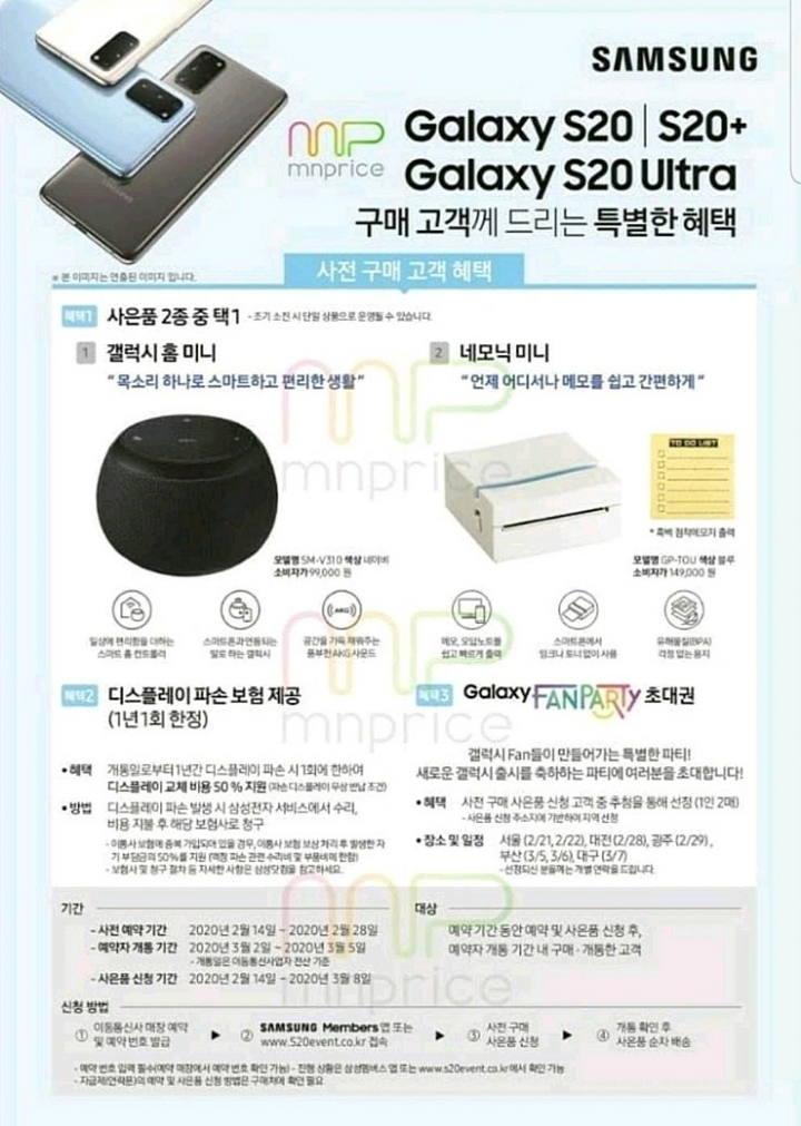 다음 유출 사진을 보면은 갤럭시 S20의 구매 혜택들을 확인할 수 있습니다.