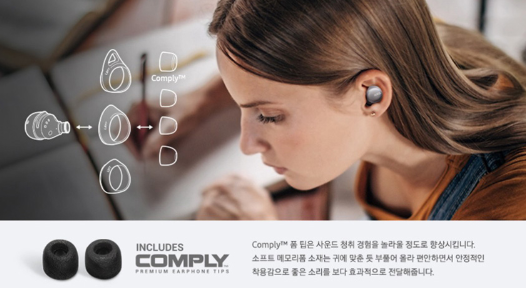 그리고 기본 구성으로 폼팁이 들어갑니다. 폼팁은 자신의 귀에 알맞게 부풀어 올라 착용감을 편하게 해주고 음질 향상도 이루어집니다.