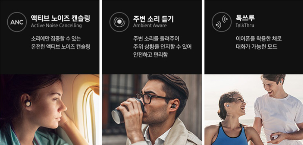 그리고 이 이어폰은 총 3가지 모드를 지원하는데요, 노이즈 캔슬링, 주변 소리 듣기, 그리고 대화 모드 (톡쓰루)를 지원합니다. 참고로 대화 모드는 노이즈 캔슬링 상태에서 대화를 하게 해주는 모드입니다.