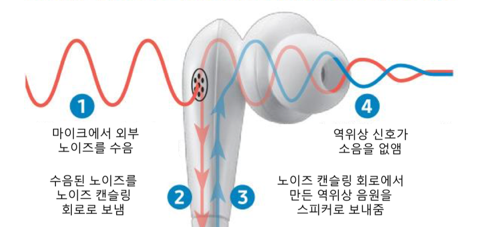 참고로 노이즈 캔슬링의 원리는 마이크가 바깥소리를 인식을 하고 그 소리 파형의 정반대의 소리를 내면서 마치 소리가 안 들리는 것처럼 만들어 주는 것입니다.