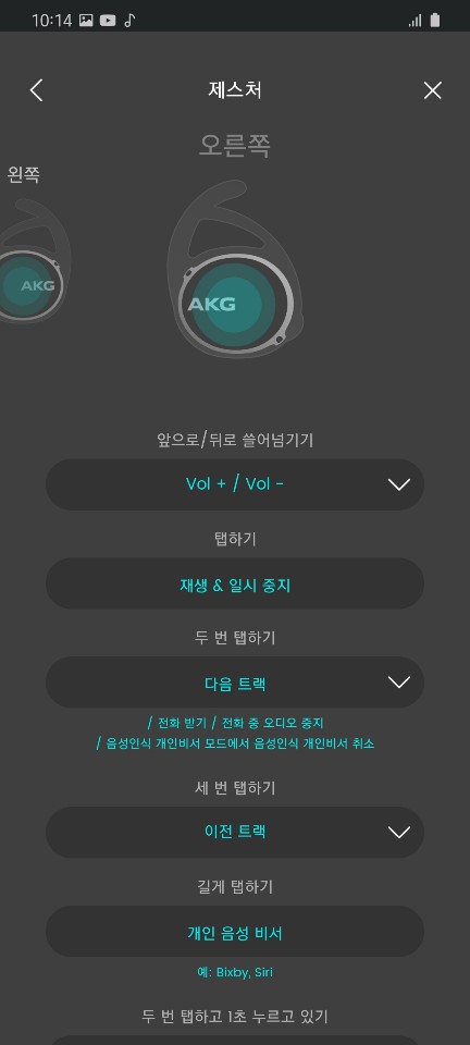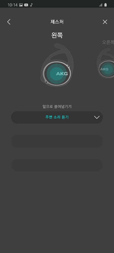 터치 제스처는 앱에서 설정이 가능한데요, 왼쪽에는 스와이프 제스처로 주변음 소리 듣기나 토크스루를 선택할 수 있었고
