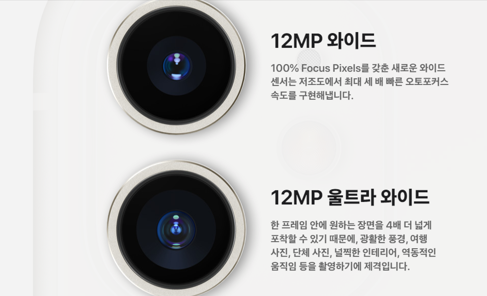 아이폰 11은 광각 카메라와 일반각 카메라가 탑재되었고 프로 모델은 망원 카메라가 추가되었습니다.