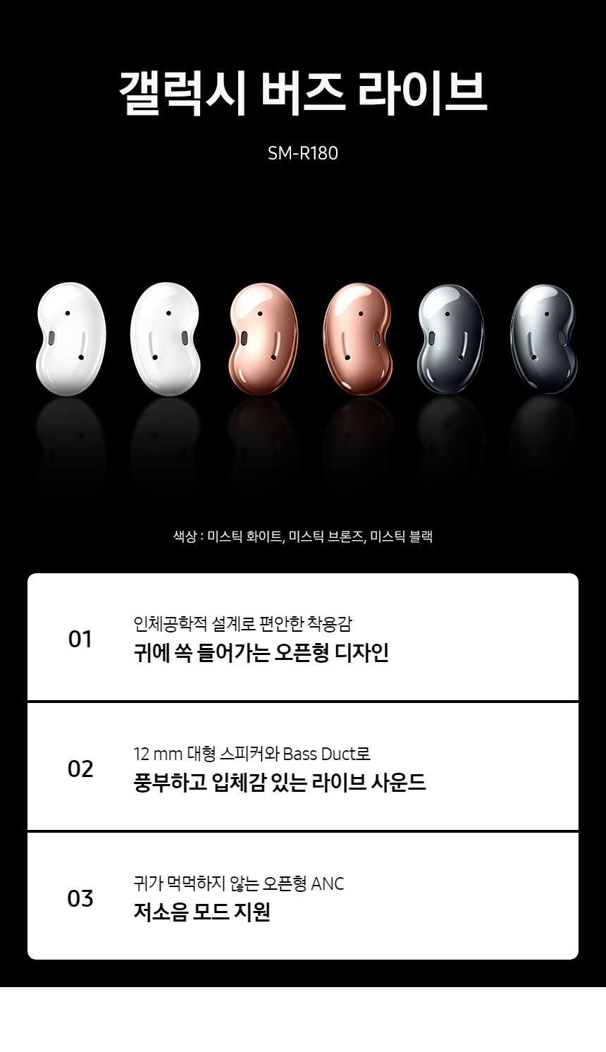 첫 번째 사진은 갤럭시 버즈 라이브의 이름과 모델명이 나와 있습니다. 색상은 3가지로 보이고 디자인, 음질, 노이즈 캔슬링을 강조하고 있습니다.