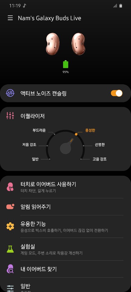 그래서 버즈 설정에서 이퀄라이저를 풍성한 또는 선명한으로 설정하니까 좀 나아졌습니다.