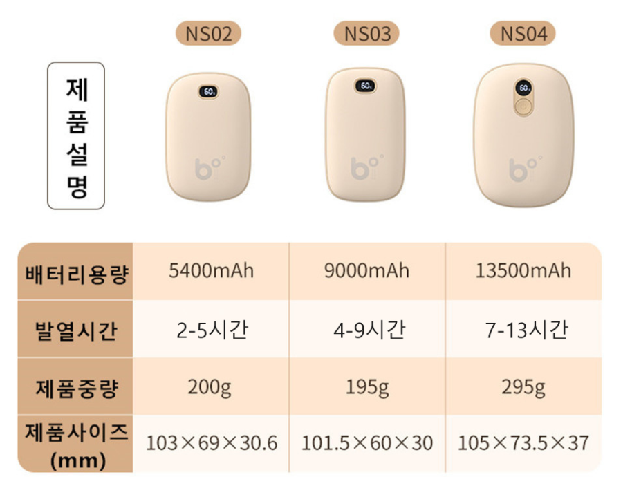 색상은 베이지와 오렌지 2가지 색상이 있고 크기는 5400mAh, 9000mAh, 13500mAh 세가지가 있습니다.