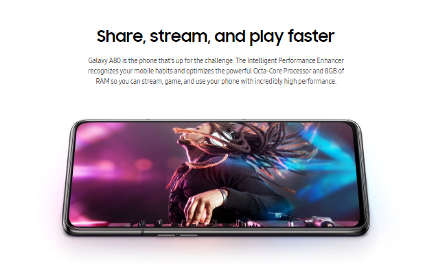 갤럭시 A80은 수화부 스피커를 대신할 G8에 들어간 것과 비슷한 디스플레이 스피커도 탑재했습니다.