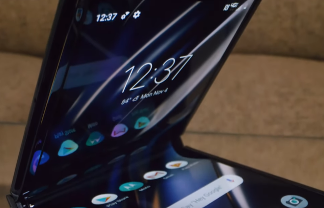 폴더폰 같이 펼치면 긴 스크린이 펼쳐지게 되고 아래쪽에 두꺼운 베젤이 있습니다.