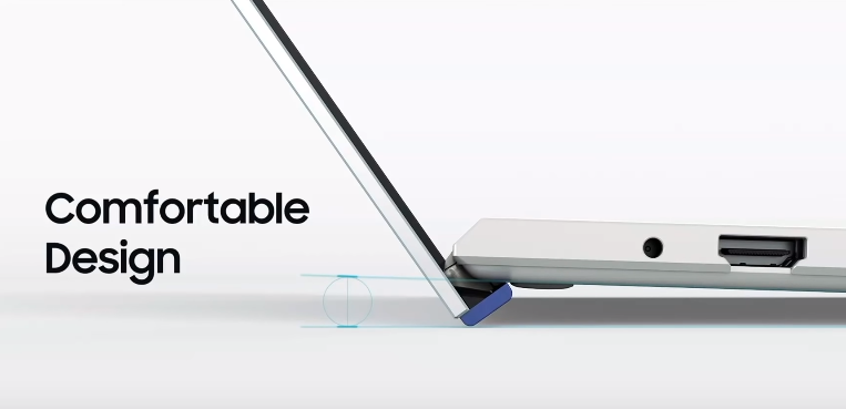 갤럭시 북 이온은 플렉스와는 다르게 힌지가 360회전이 안 되지만 힌지를 이용하여 발열을 줄였다 합니다. 아래 사진을 보시면 노트북이 살짝 올라와 있는 것을 확인할 수 있습니다.